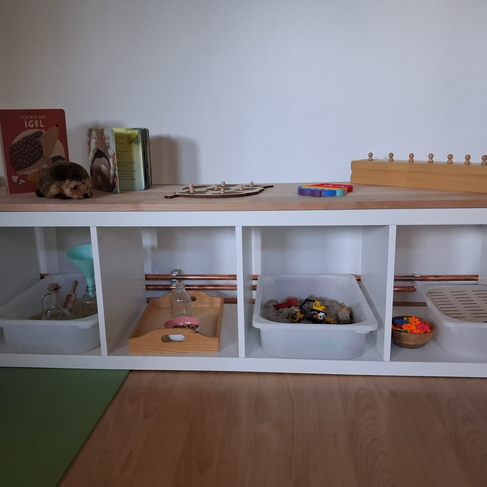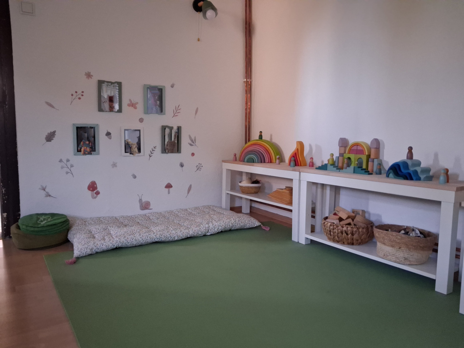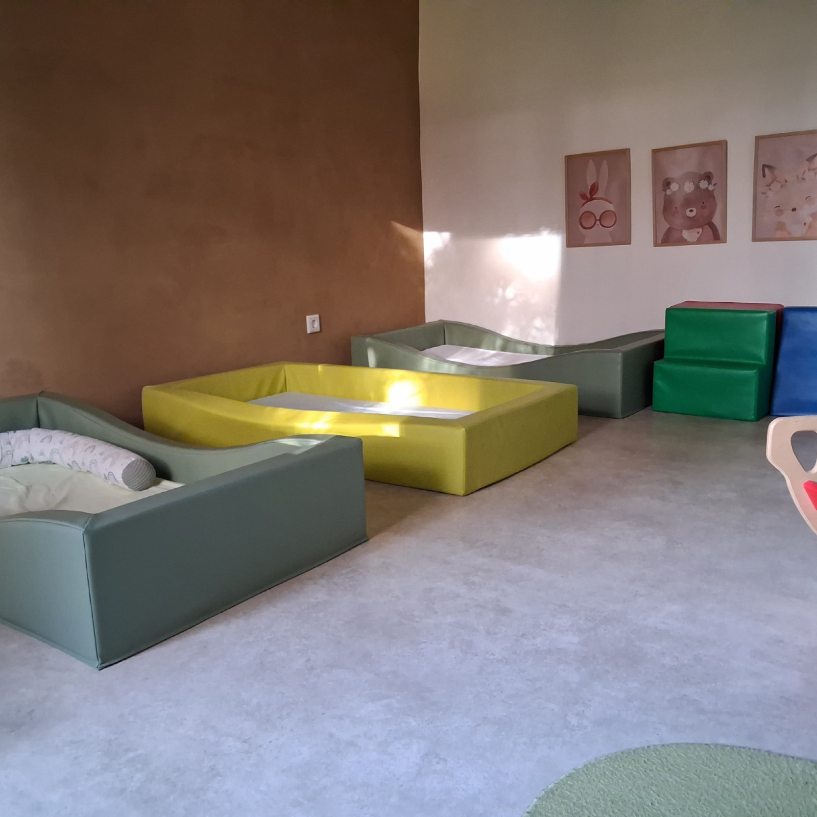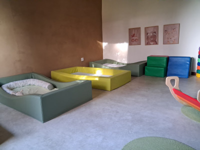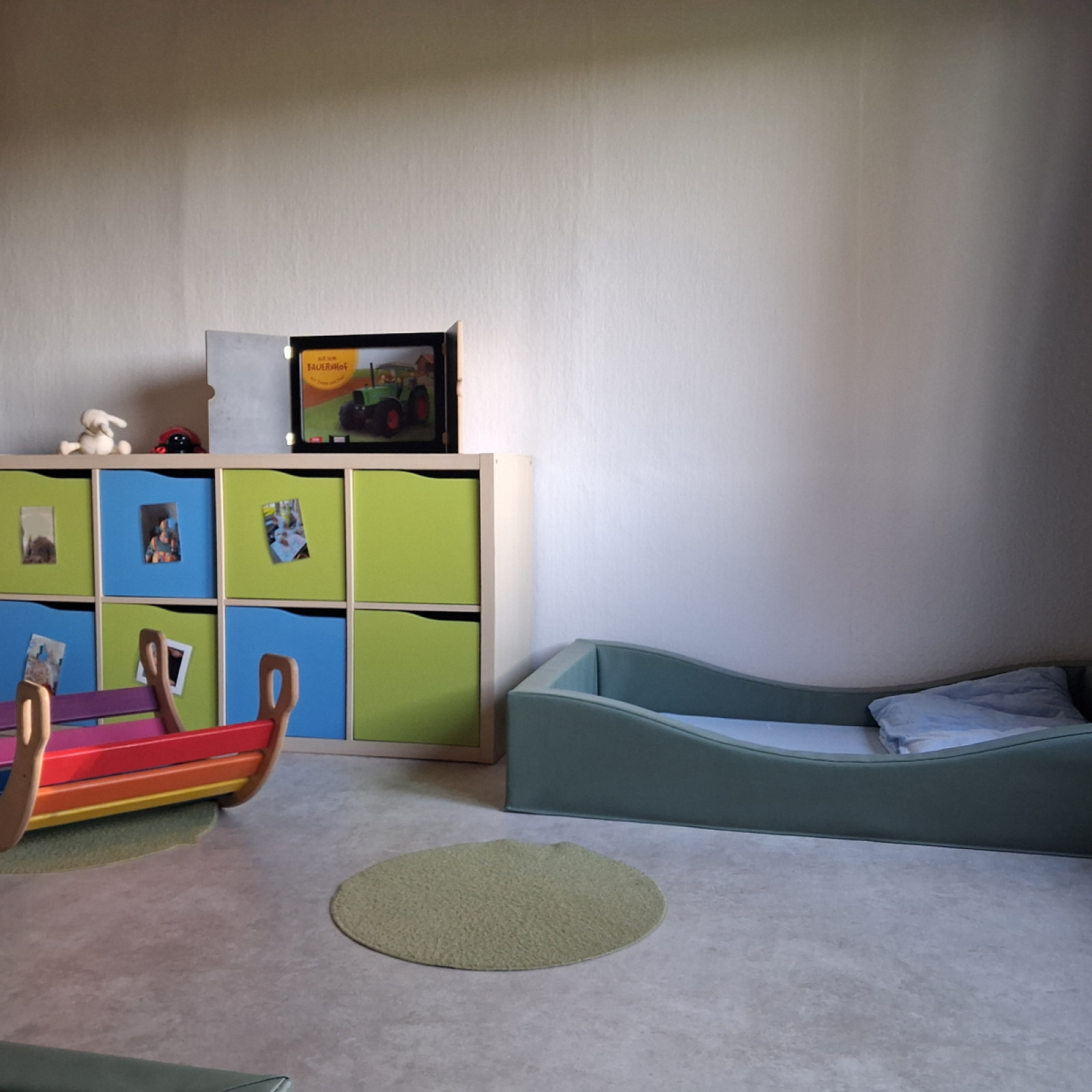 Der eigene Spiel-/ Betreuungsraum ist dabei das Herzstück und lädt die Kinder mit verschiedenen Bereichen zum Spielen, Konstruieren, für Sinneserfahrungen und zum Lesen ein.