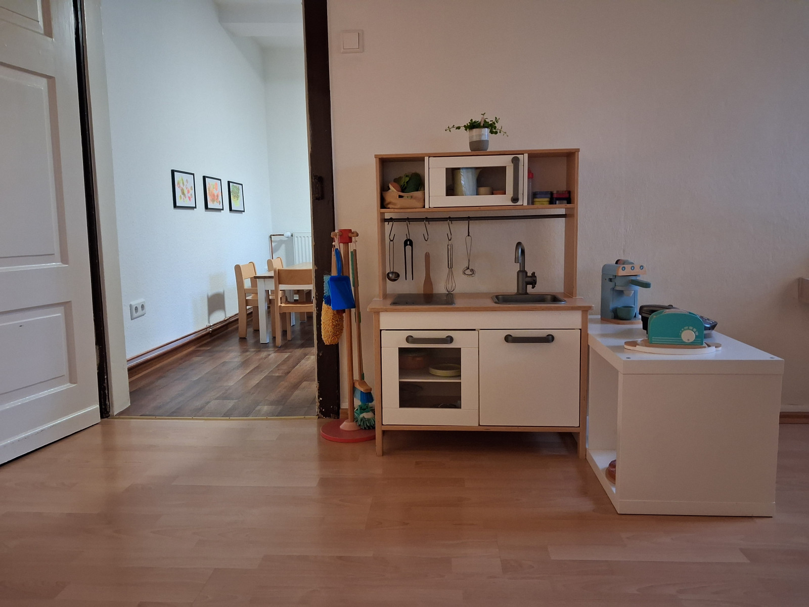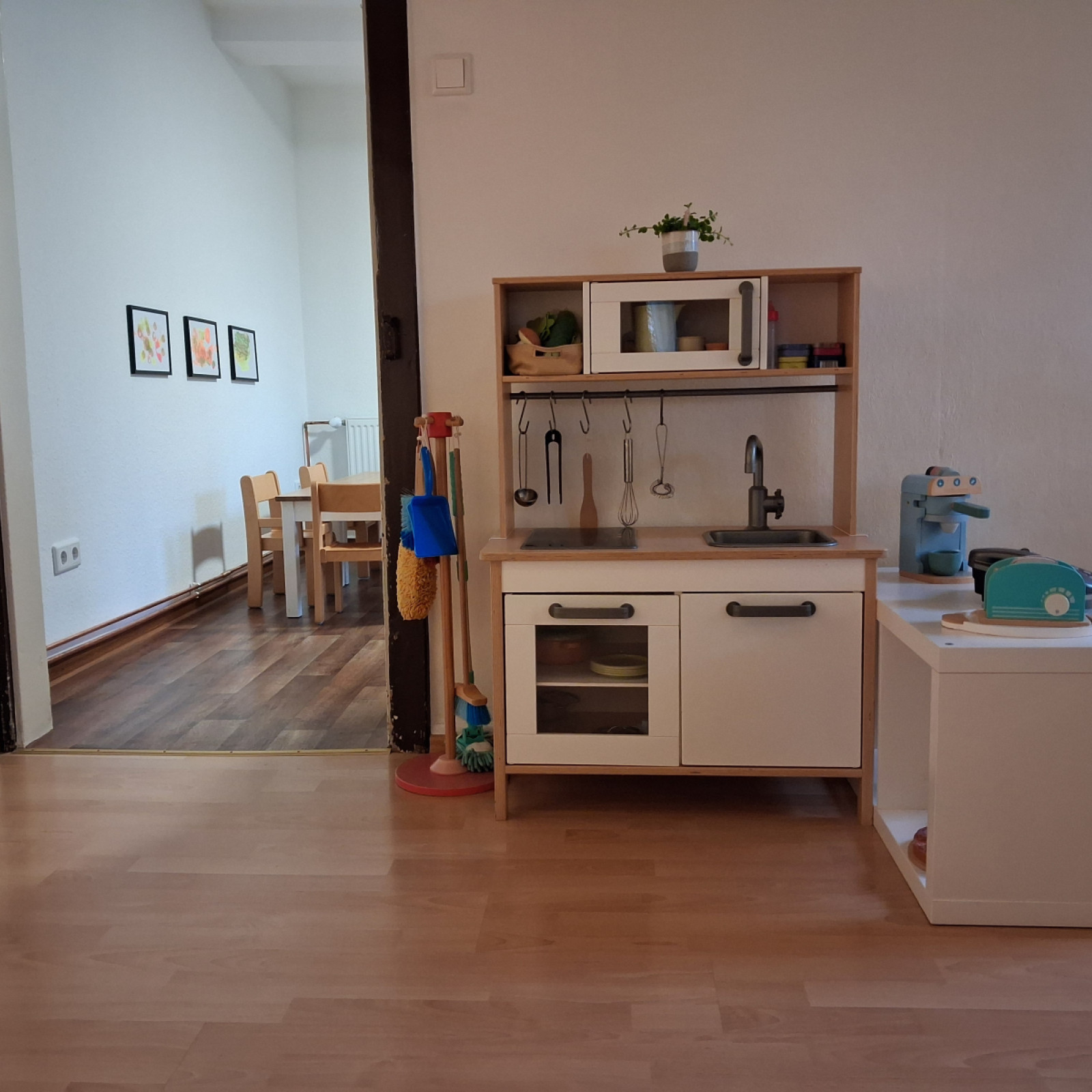 In der Küche nebenan befindet sich eine für die Kinder passende Sitzgelegenheit aus Tischen und Stühlen.
