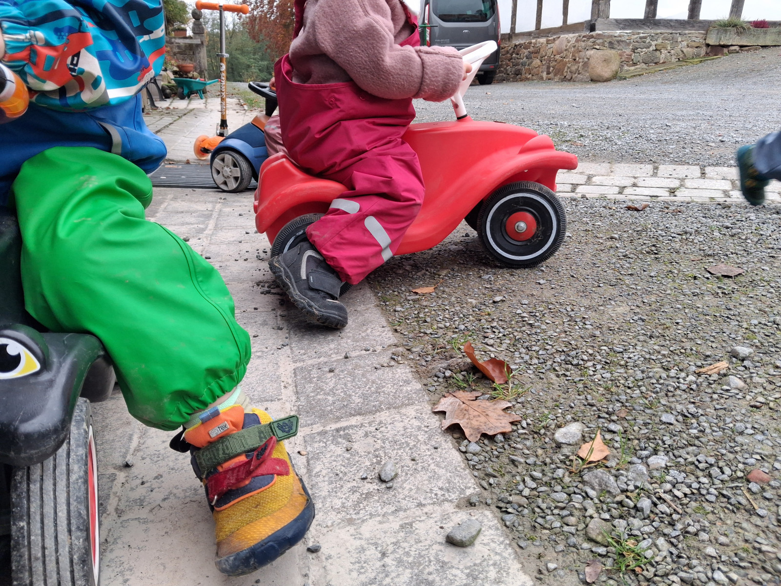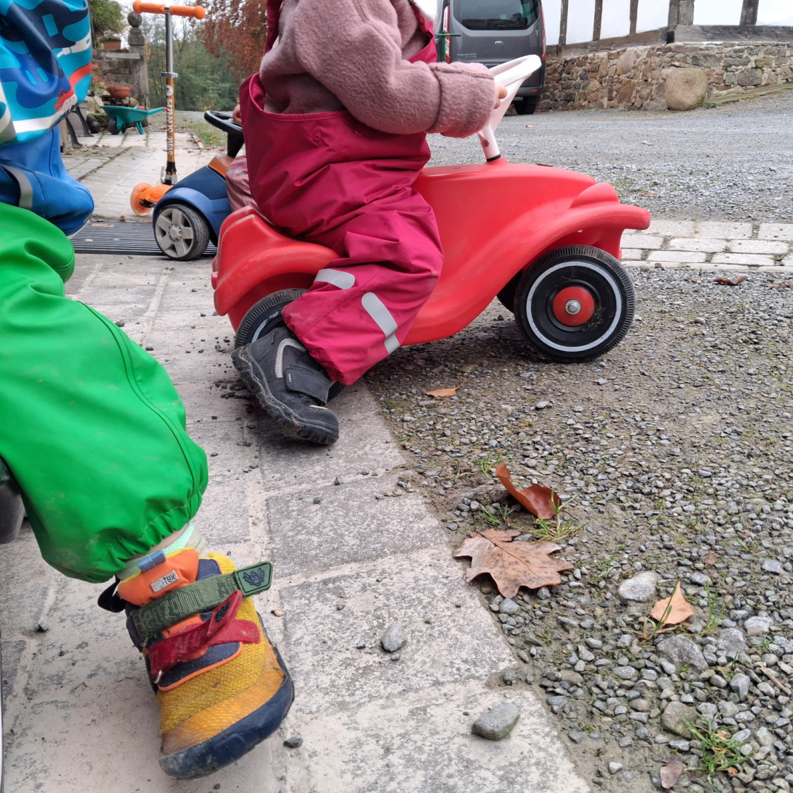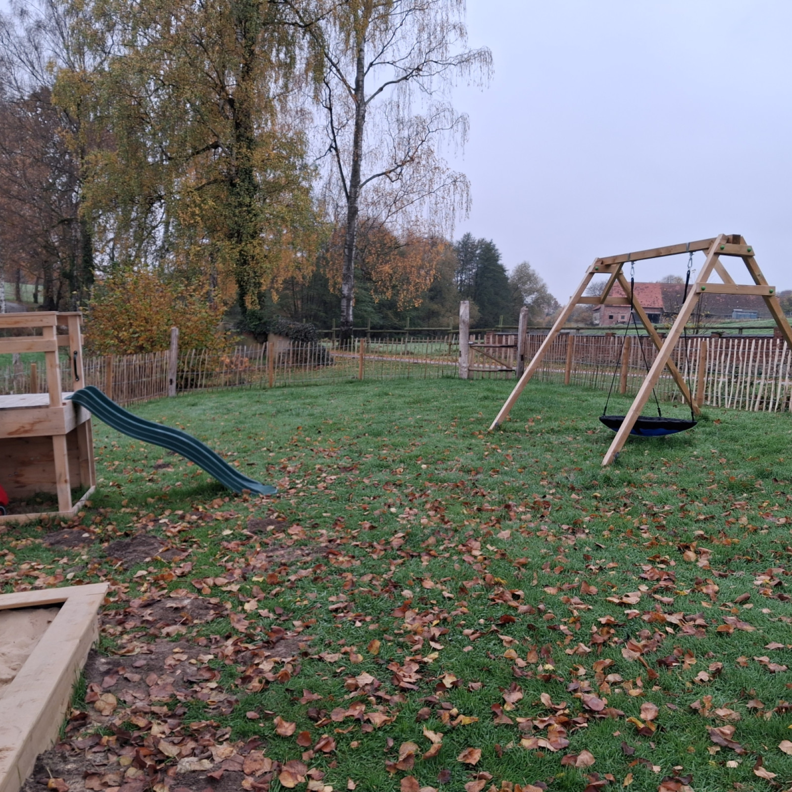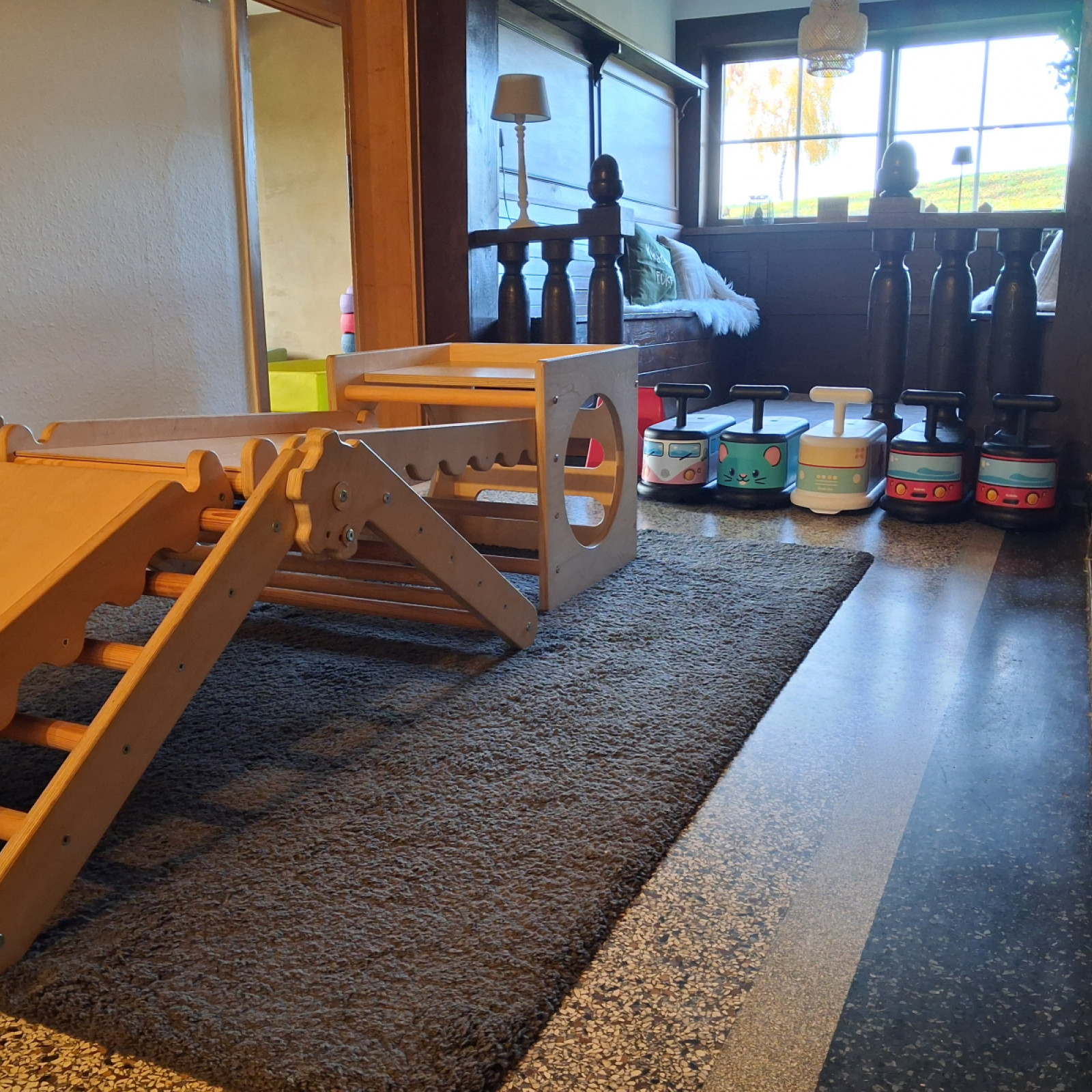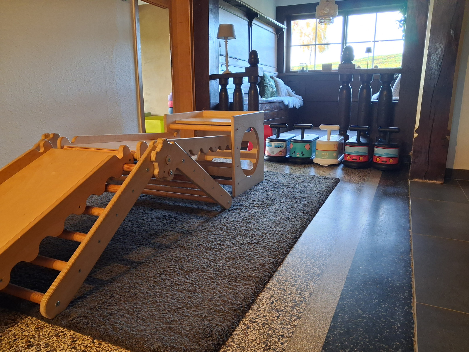 Dort stehen Rutschfahrzeuge sowie ein Kletterdreieck mit Rutsche für die Kinder bereit.