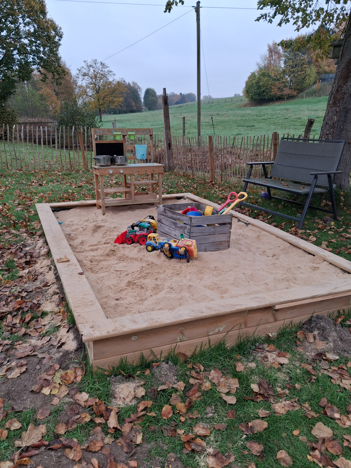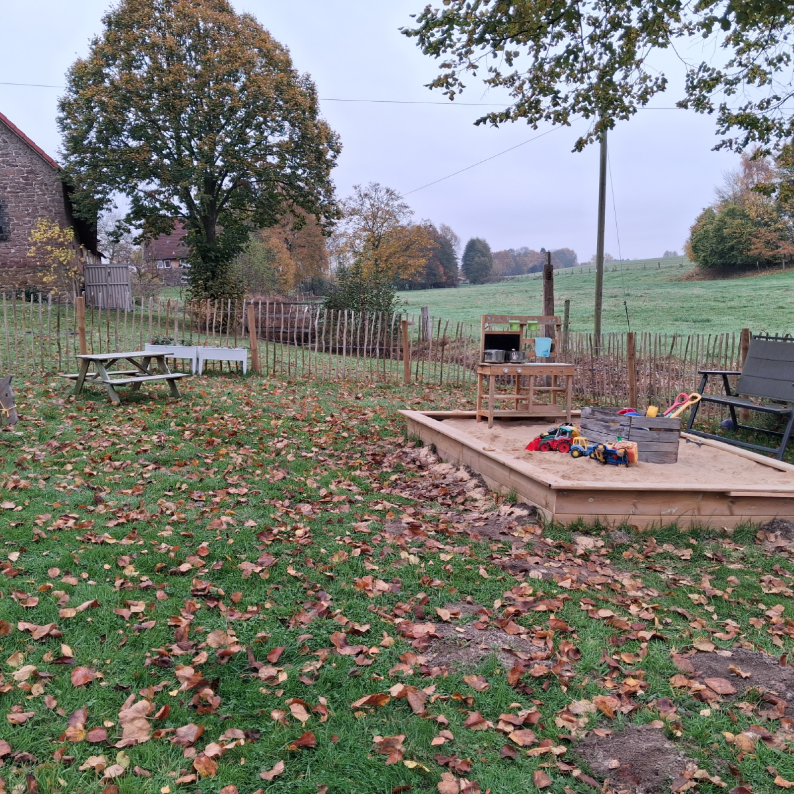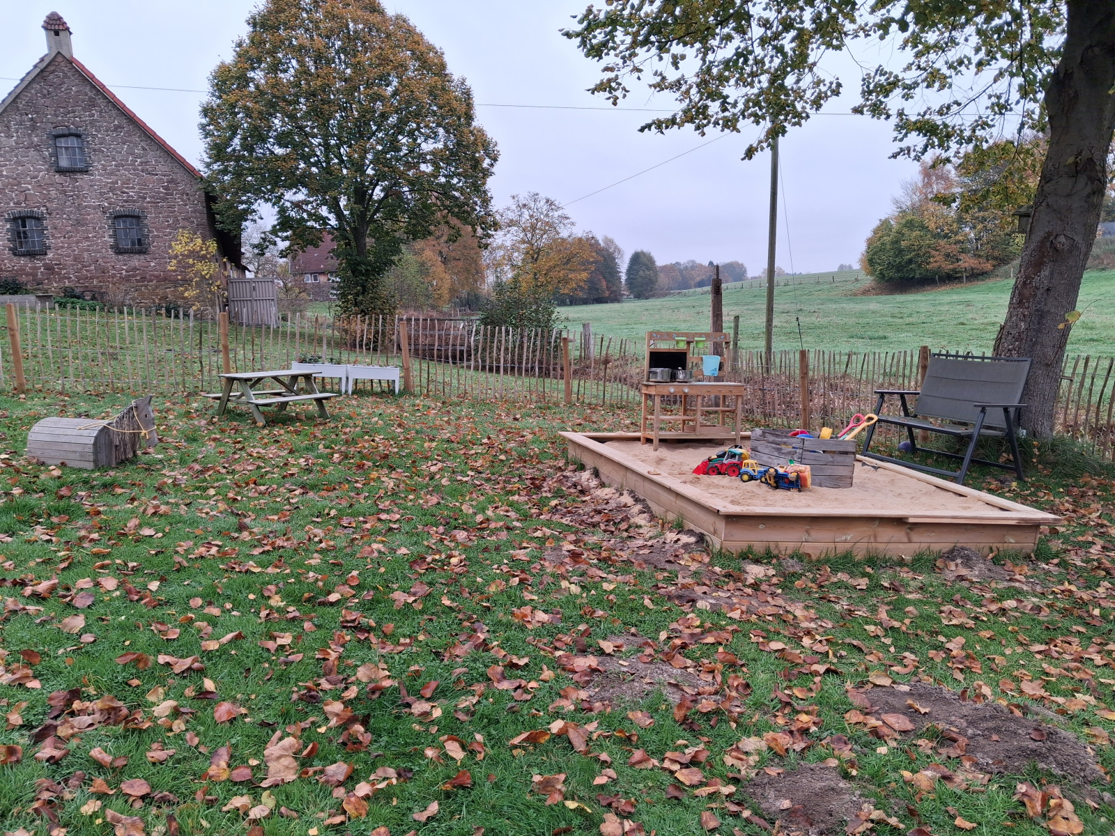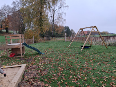 Der komplett eingezäunte Garten lädt zum entdecken und bewegen ein. Dort gibt es einnen großen Sandkasten mit Matschküche, eine Nestschaukel, ein Kletterturm mit Rutsche, ein Holzpferd, verschiedene Fahrzeuge und ein Hochbeet, das wir gemeinsam bepflanzen.